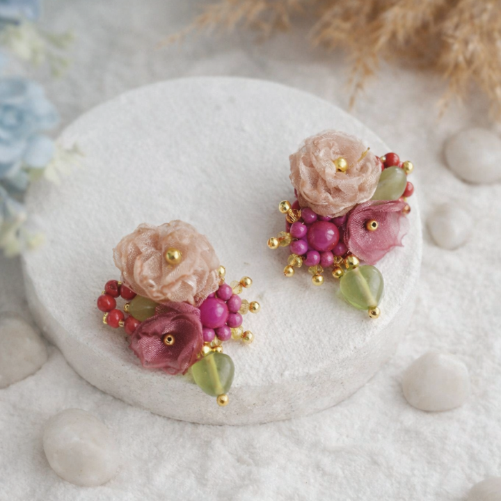 These earrings feature delicate fabric florals in blush and rose tones, paired with playful pink and green beads and subtle golden accents. Each element is assembled by hand, allowing the design to grow organically — no two pairs exactly alike, just like flowers in a garden.