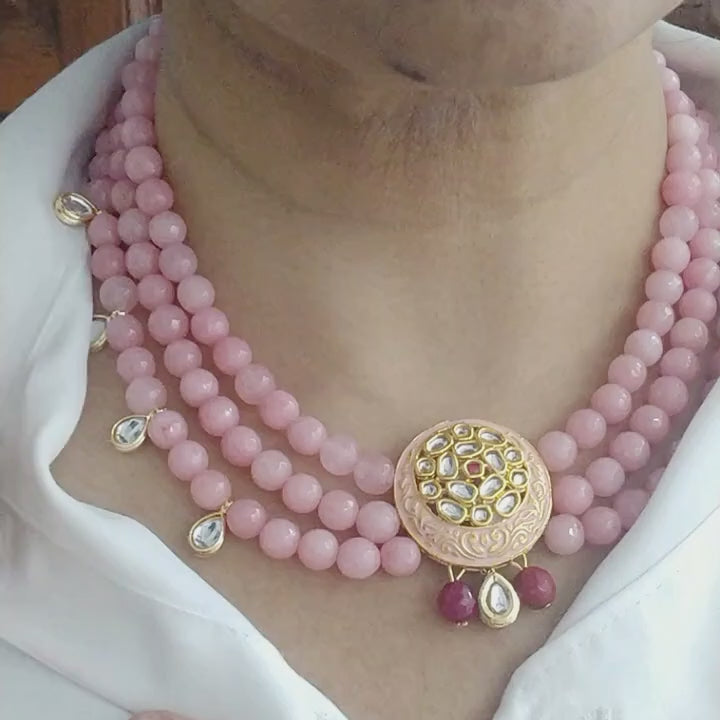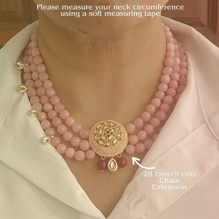Made with premium blush agate beads, each strand reflects a gentle, diffused luminosity reminiscent of moonlight on still water. At the center rests the Mehtab medallion — an intricately carved Kundan emblem that radiates old-world charm and contemporary finesse. Its finely set Kundan droplet paired with ruby-hued bead accents adds a delicate regal movement with every turn of the head.