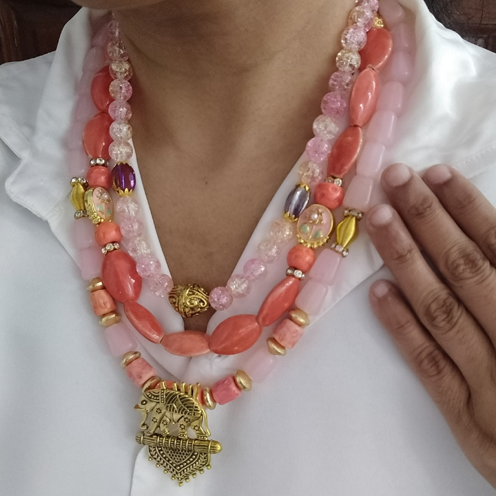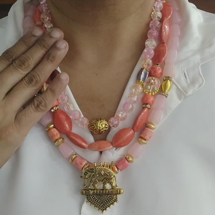 From the Bawri Collection comes the Blushfire Necklace — a statement in wild grace and raw elegance. Hand-strung with tumbled blush pink beads, kundan beads to accentute the ethereal essence, glowing with softness, paired with coral oval porcelain beads that bring earthy boldness, and crackle glass beads that shimmer with untamed light.