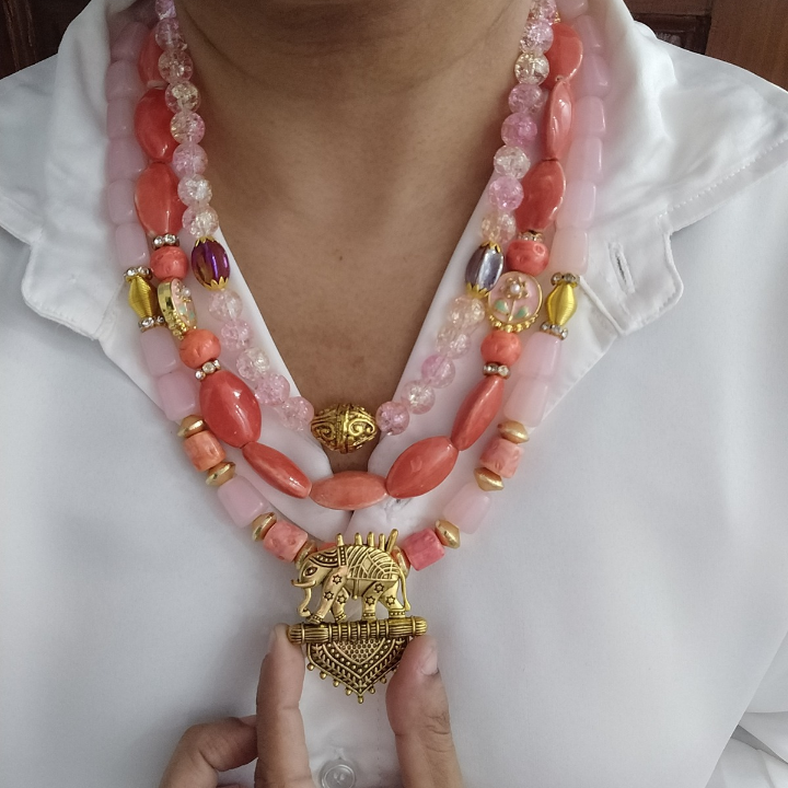 Anchored with antique gold accents and a striking pendant, this three-layered necklace is a story of contrasts — delicate yet daring, raw yet ethereal.