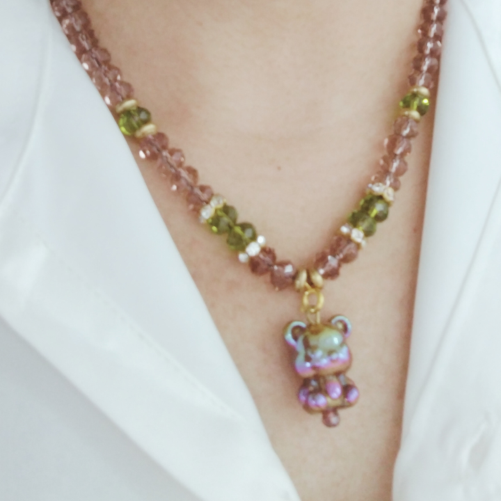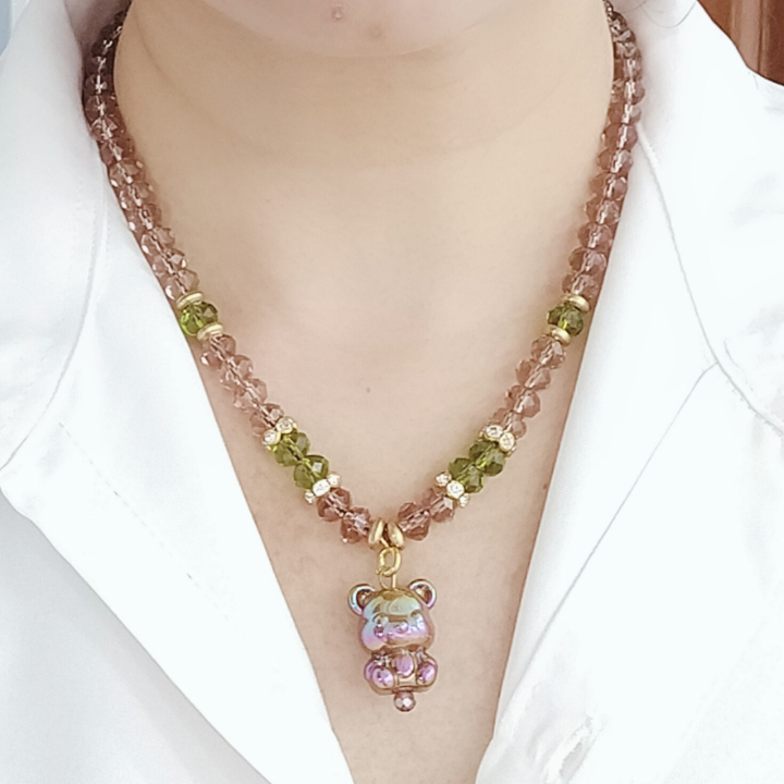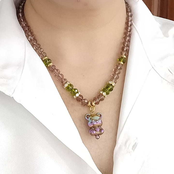 The Bubble Trouble Bearlet is a handcrafted crystal necklet featuring blush-toned glass beads, olive accents, and a glimmering iridescent teddy charm — suspended like a childhood secret dressed in designer sparkle.