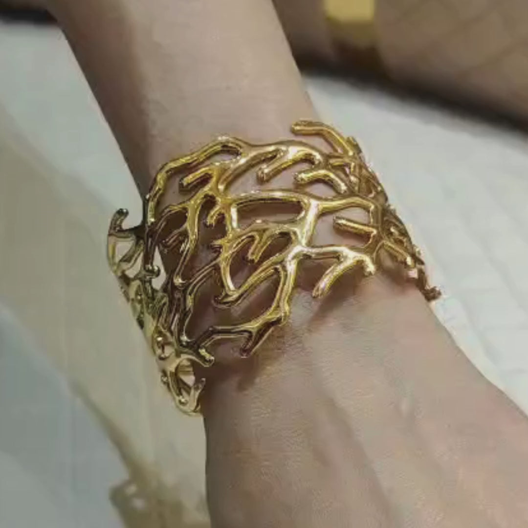 Inspired by organic coral formations, this openwork cuff in a rich gold-tone finish is designed to make waves. Lightweight yet sturdy, its artful structure wraps around your wrist like wearable art — perfect for festive edits or high-fashion everyday looks.