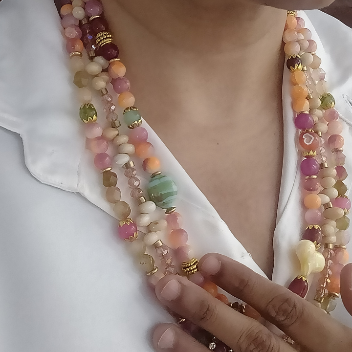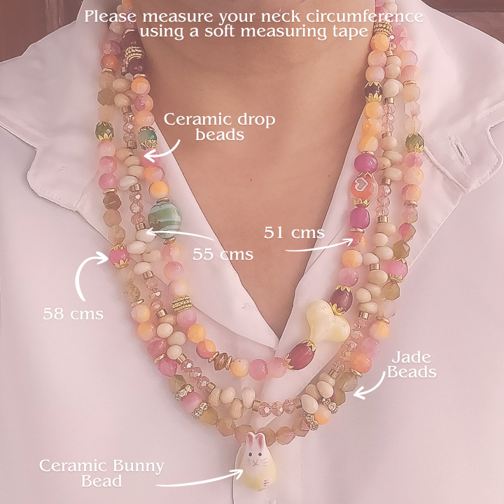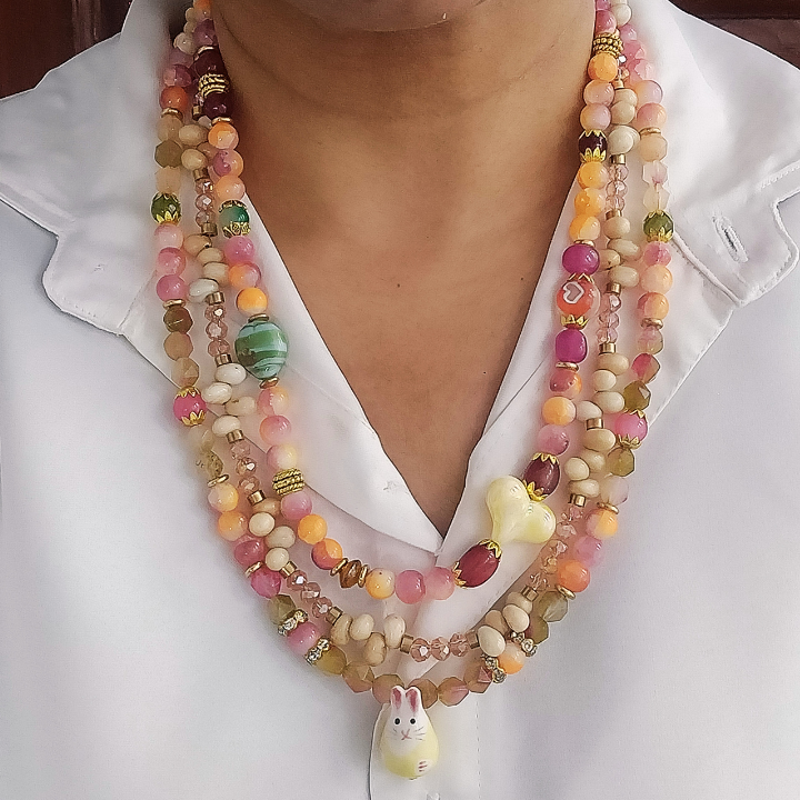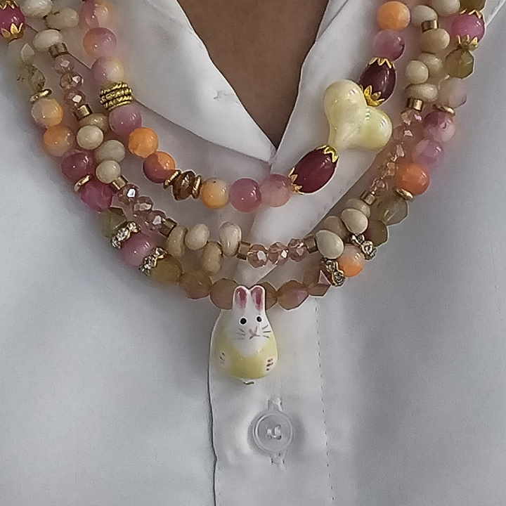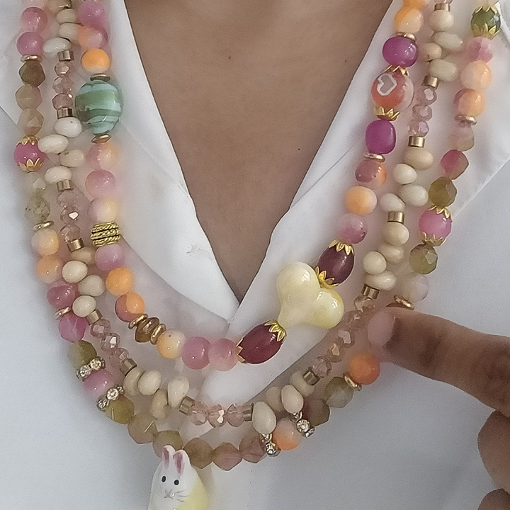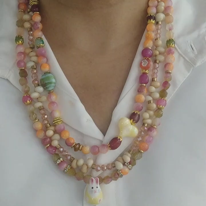 Hand-strung with polished beads in hues of rose, amber, jade, and ivory, each layer tells a story of nature’s palette at sunrise. Golden accents and faceted gems shimmer with subtle brilliance, while whimsical ceramic charms — a bunny and a heart — embody innocence, renewal, and gentle wonder.