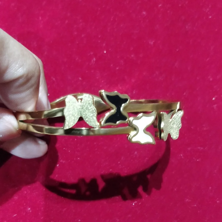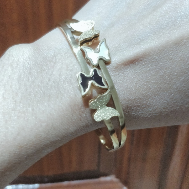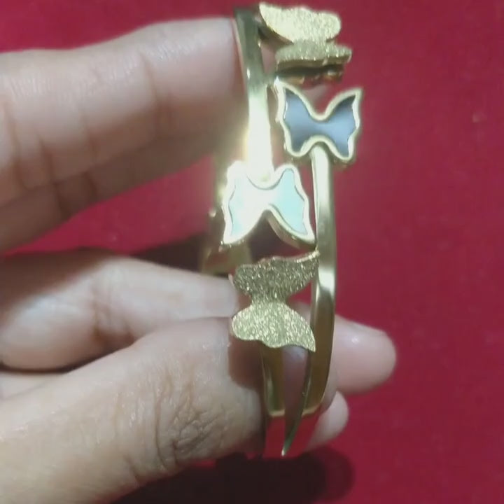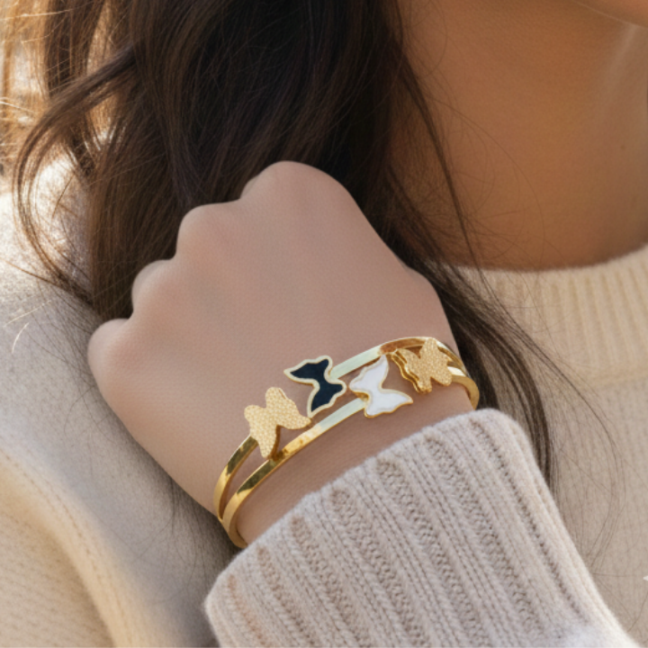 The FlutterGlow Kada features a charming trail of butterfly motifs in mixed textures—matte gold, white enamel, and black enamel—delicately arranged on a sleek gold-tone band. Symbolizing transformation, lightness, and grace, this piece adds a feminine yet bold edge to your everyday stack.