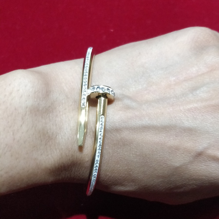 The Glam Nail Kada features a bold, nail-inspired design — elegantly curved and wrapped into a bangle silhouette, encrusted with shimmering crystals. Crafted in a glossy gold-tone finish, this piece effortlessly blends edginess with elegance.