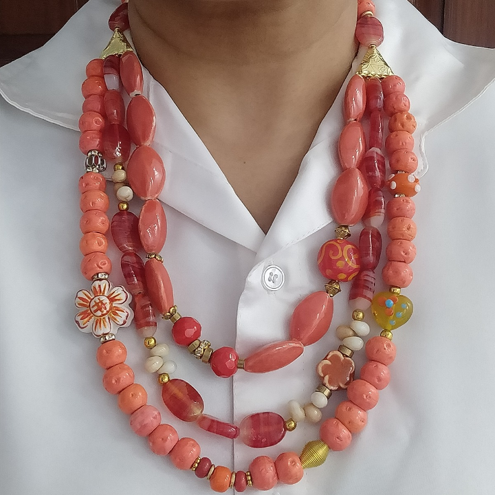 Featuring a rich mix of peach, coral, and red-toned glass and porcelain beads, this necklace blends smooth ovals, chunky textured beads, playful patterned pieces, and hand-painted floral charms. Every strand carries its own rhythm, but together they create a beautiful, festive harmony — just like a lively gupshup circle.
