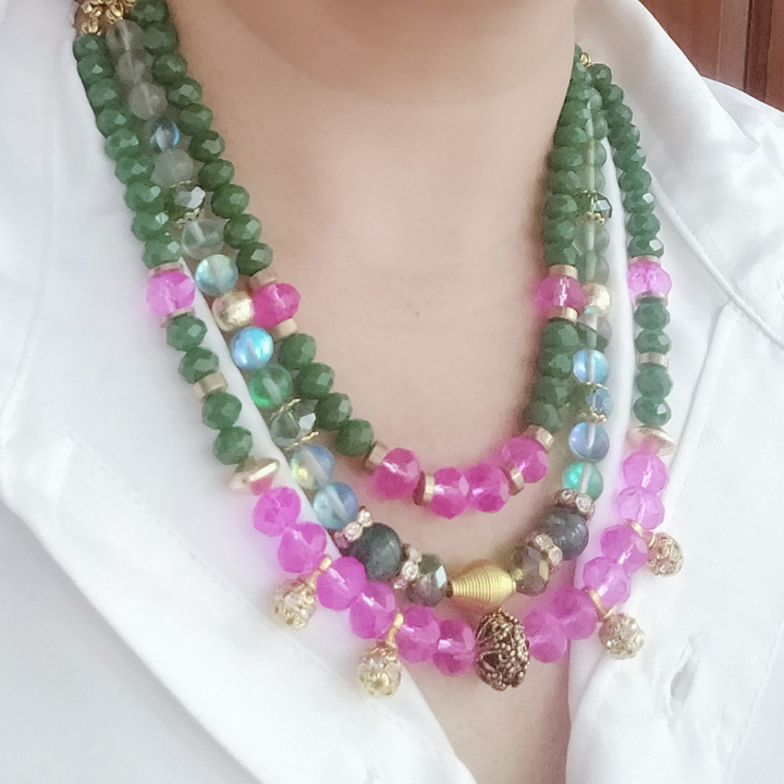 The Jardin Majesté is a 3-layered stunner handcrafted with vibrant glass beads in jewel tones, gold-toned brushed anti-tarnish beads, and rhinestone spacers for that extra pop of sparkle. Designed with an adjustable hook closure, this necklet fits like it was made just for you.