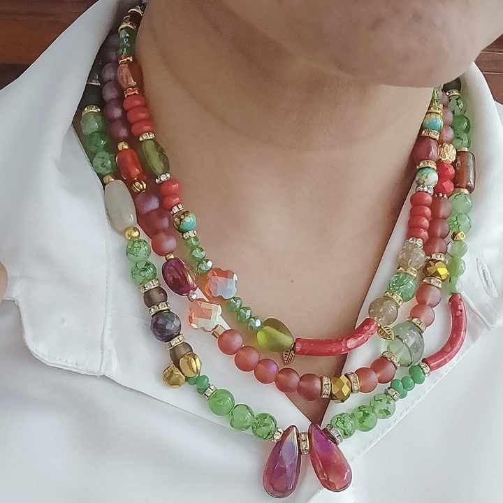 The bold red pipe beads and the eclectic hanging glass beads evoke the exuberance of a forest fiesta, inviting you to embrace every moment with enthusiasm.