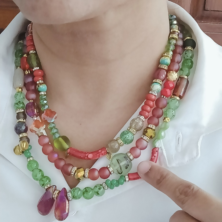 This piece is a lively mosaic of rich hues—pinks, greens, earthy browns, and fiery reds—accentuated by a charming brass elephant charm, symbolizing wisdom and celebration. The dangling glass beads add a touch of movement and uniqueness, making this necklace a true showstopper for all your joyful gatherings.