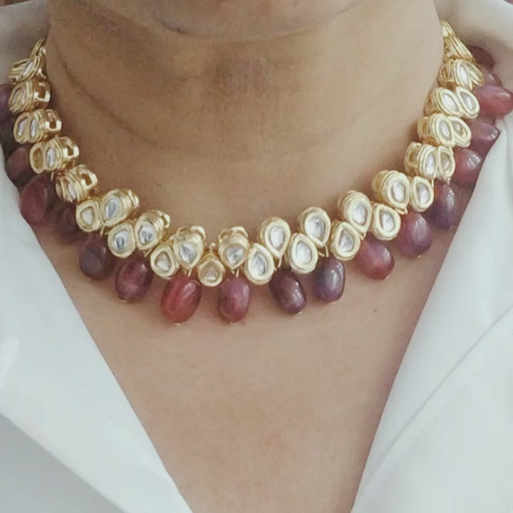Compact and sculptural, the collar nests a ring of hand-set Kundan polki that catch light like tiny petals. Suspended beneath, polished rose- and ruby-hued agate drops riff on the imagery of a flower in full bloom, lending motion and warmth to the silhouette. The matching earrings mirror the collar’s motif, completing a set that reads as both blessing and statement.