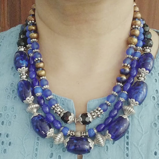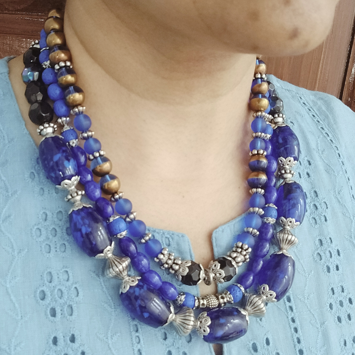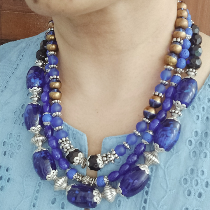 An ode to timeless elegance, Midnight Noor is a handcrafted two-layer necklace featuring deep cobalt ceramic beads, shimmering glass rondelles, and silver-brass accents. The layers flow effortlessly, held together with an adjustable chain extension, making it versatile for any occasion. A play of light and depth, this piece reflects the quiet radiance of midnight skies.