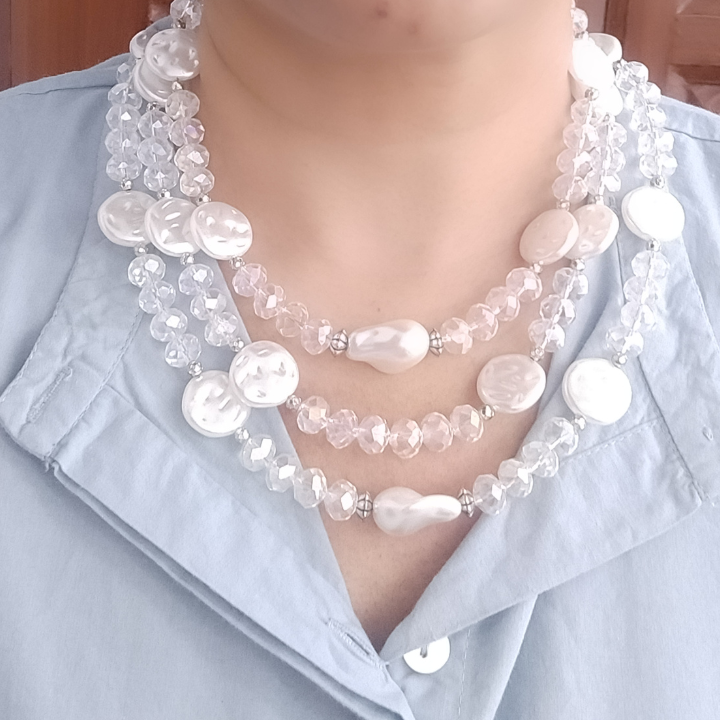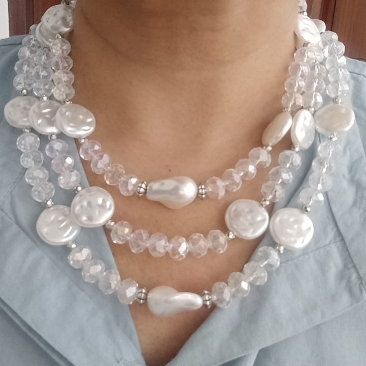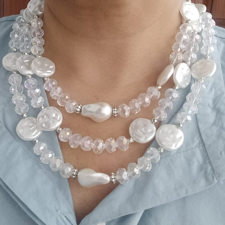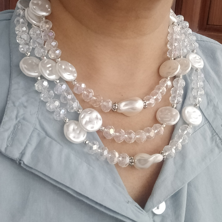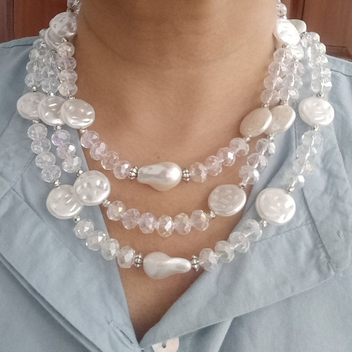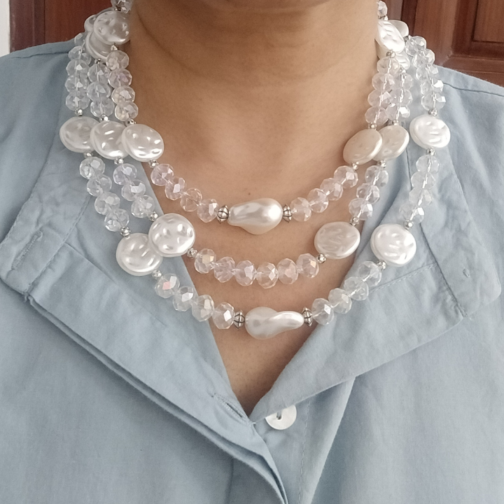 Delicate, radiant, and endlessly elegant — the Moonlit Cascade Necklace features three graceful layers of transparent faceted glass rondelle beads paired with flat-lay faux pearls, creating a shimmering effect that catches light from every angle.