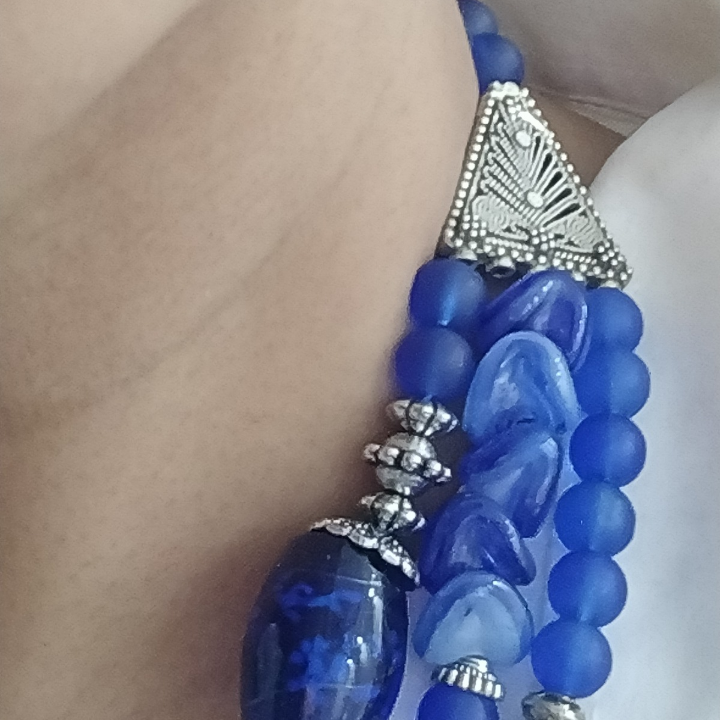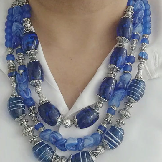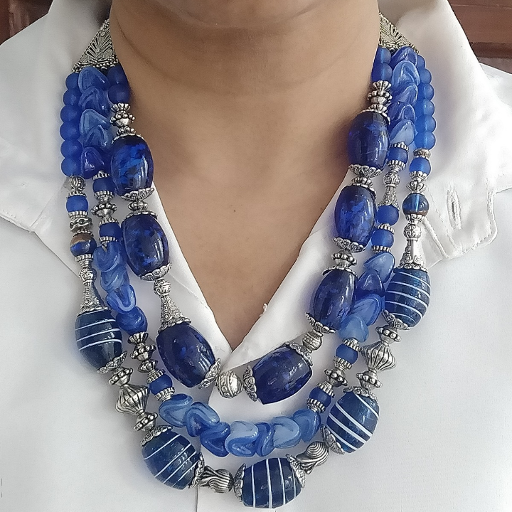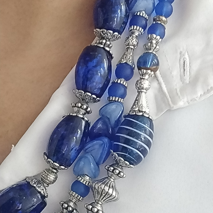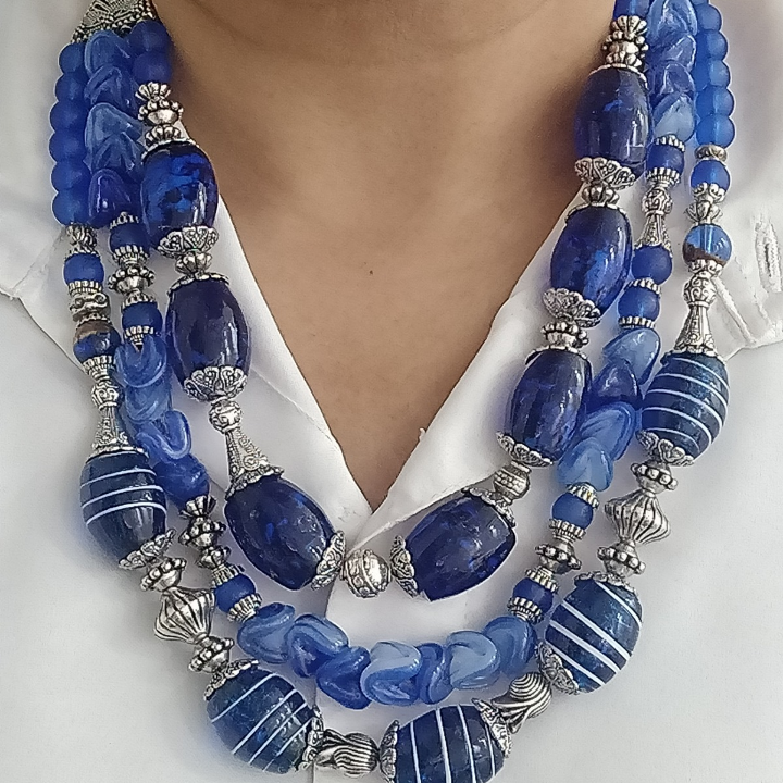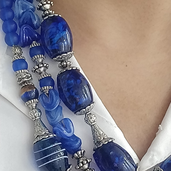 Dive into the serene allure of Neel Ambrosia—a stunning handcrafted necklace that blends bold blue chunky glass beads with shimmering silver accents for a look that's both elegant and evocative.