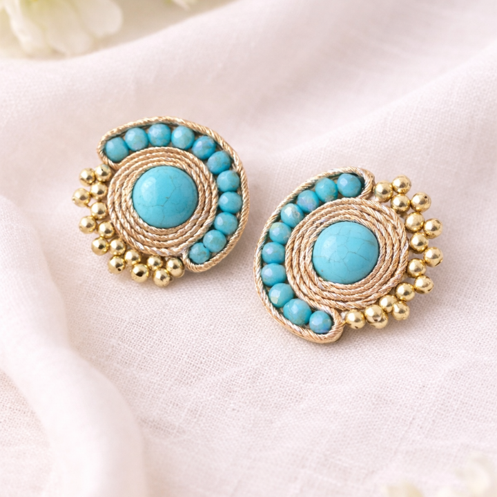 Handcrafted with a soothing turquoise centre, these earrings are framed with fine metallic cord work and delicate bead detailing that adds structure without heaviness. The circular form symbolises wholeness and balance, while the cool turquoise hue brings a calm, refreshing energy to your look.