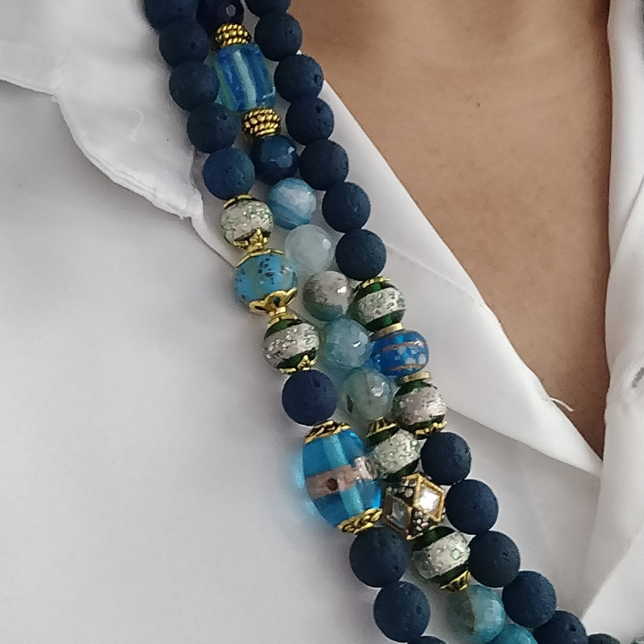 Each strand is accentuated with intricately detailed glass beads, zircon-studded accents, and vintage gold spacers, creating a mesmerizing blend of texture, color, and craftsmanship. The necklace exudes both strength and serenity—perfect for those who love to make an impression that’s bold yet graceful.
