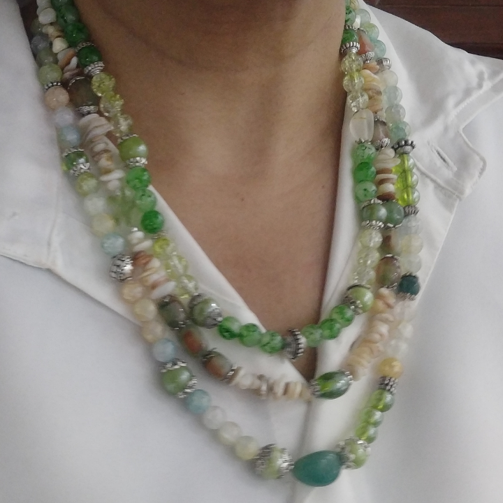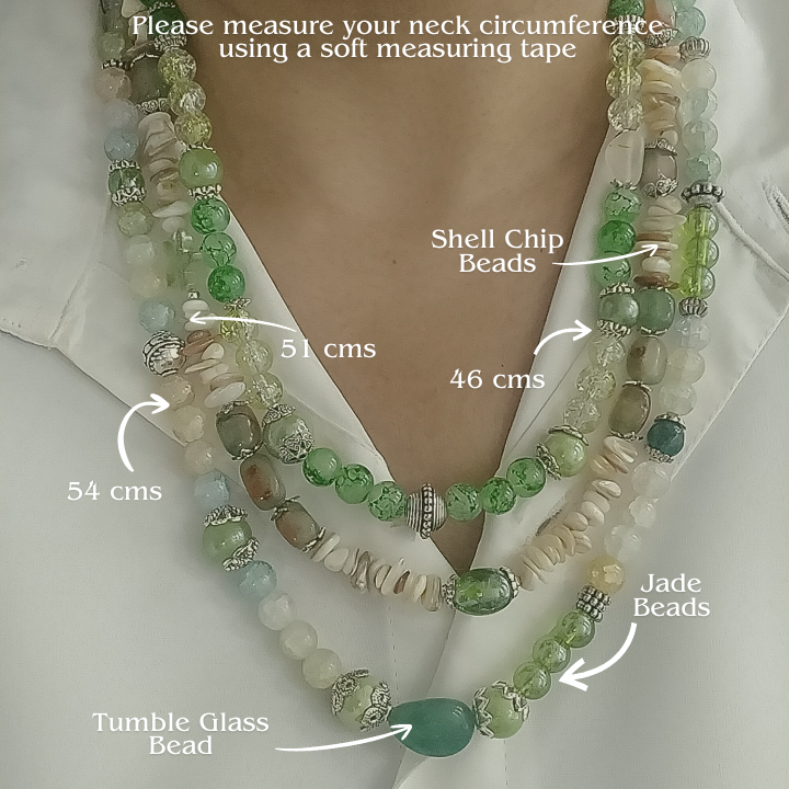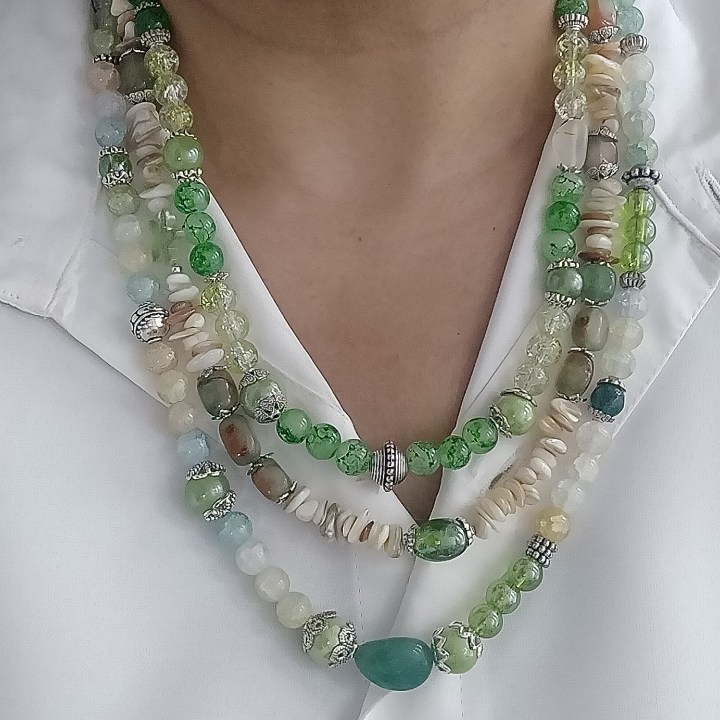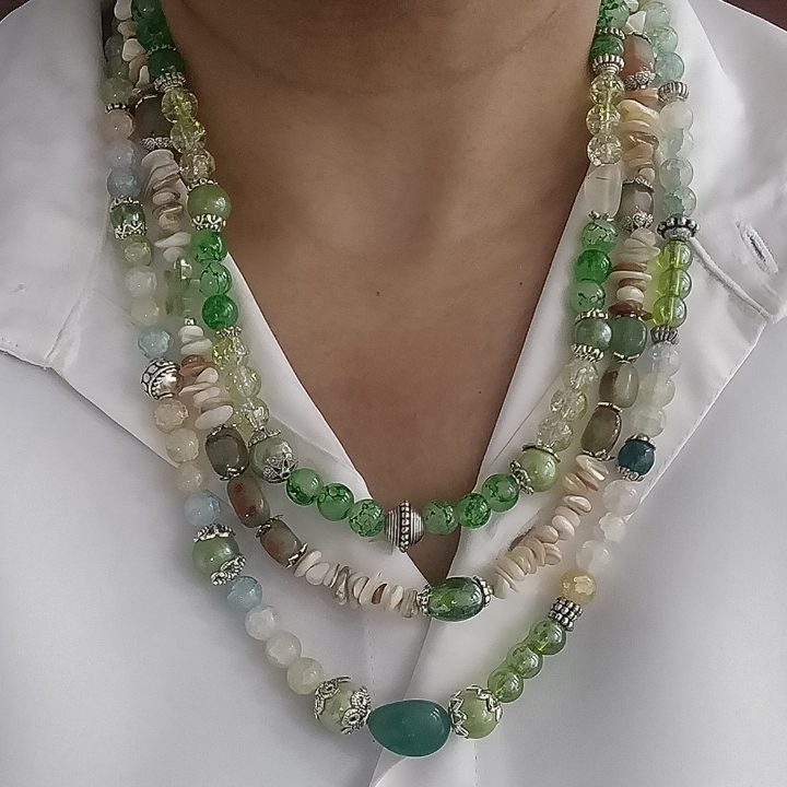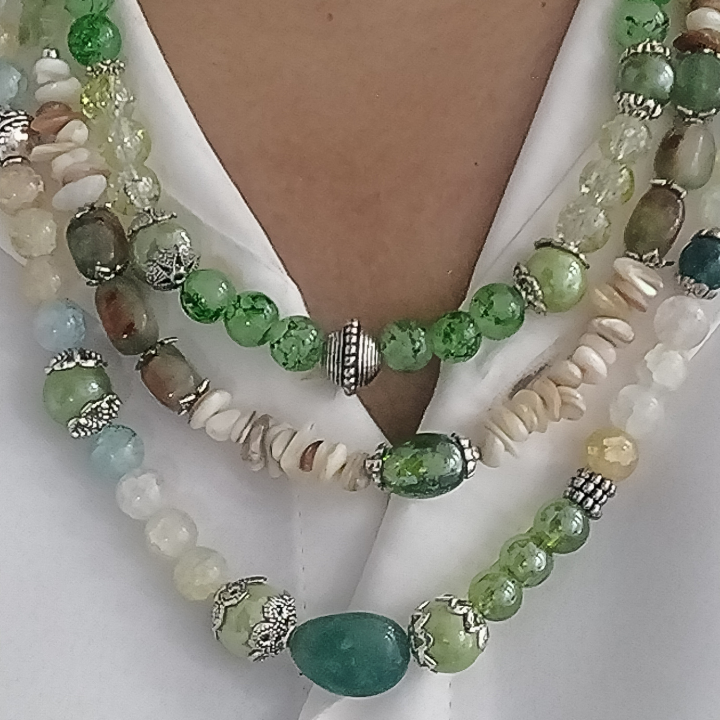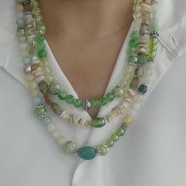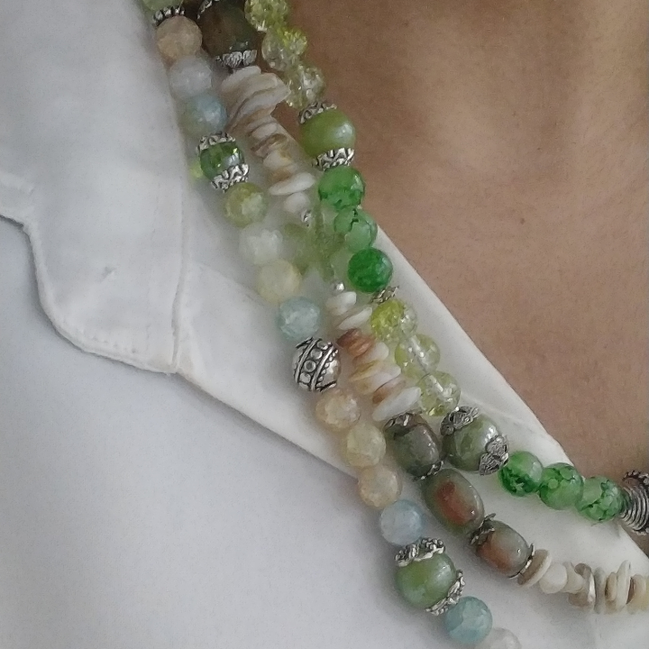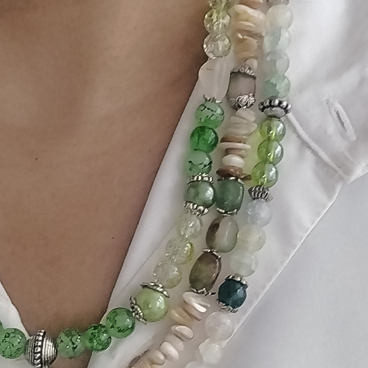 Hand-strung with Mother of Pearl chip beads that echo the shimmer of seafoam, and green and brown agates that mirror the pebbled earth beneath the tide, this piece carries the rhythm of both ocean and forest. Silver-toned accents add a quiet gleam, while the varied textures create depth and movement — just like the meeting of water and land.