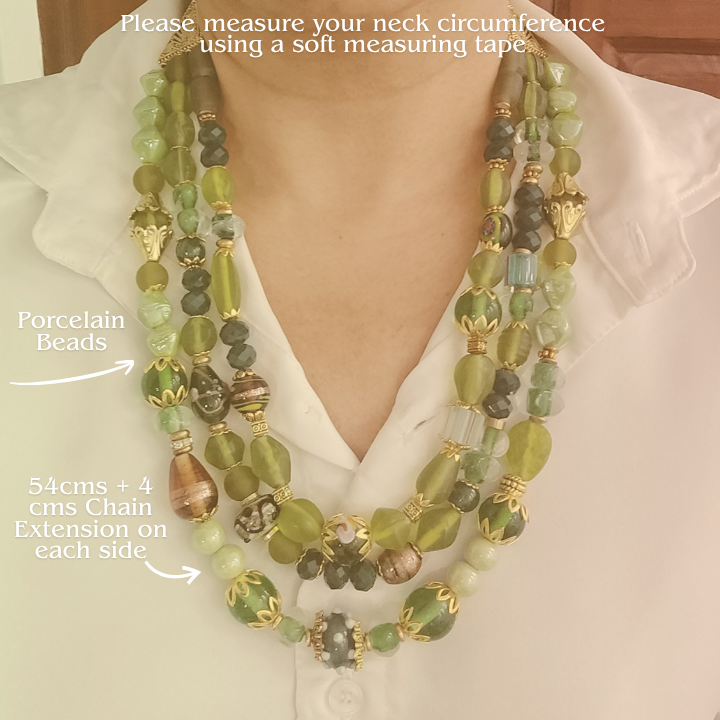 Hand-strung with jade beads, faceted glass crystals, porcelain and ceramic accents, this statement necklace celebrates nature’s quiet opulence. Every layer evokes movement — grounded yet free, gentle yet resolute — a reflection of the woman who wears it.
