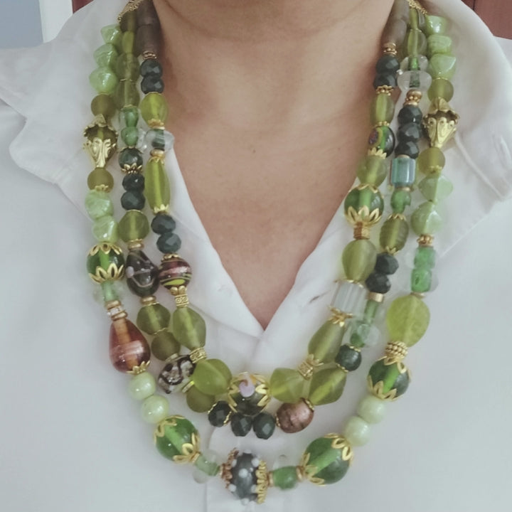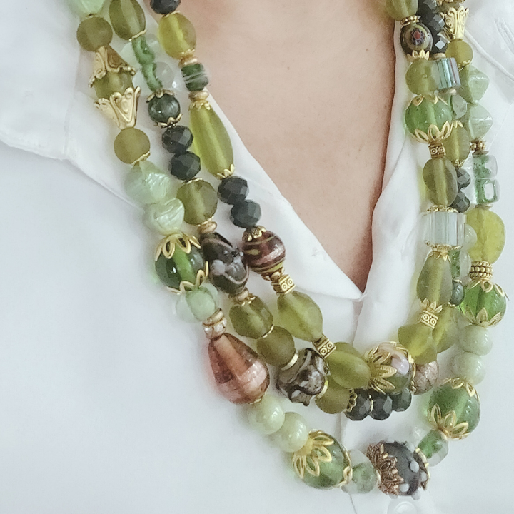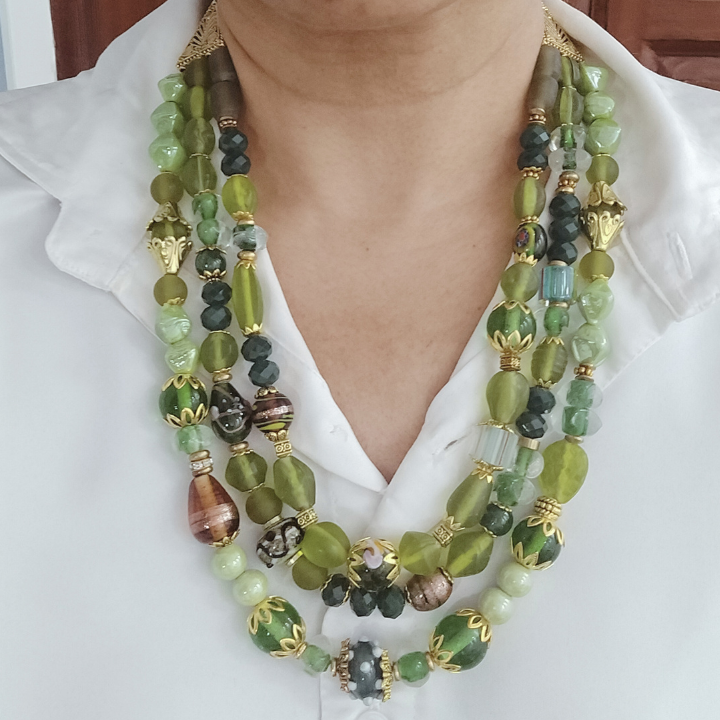 “Three verdant strands come alive in hues of moss, jade, and fern — a harmony of light and shadow, calm and courage. Each bead carries the whisper of rain-soaked soil and wild meadows, while golden accents glimmer like the sun breaking through leaves at dawn.”