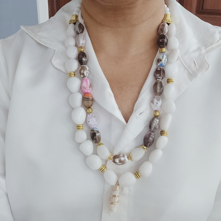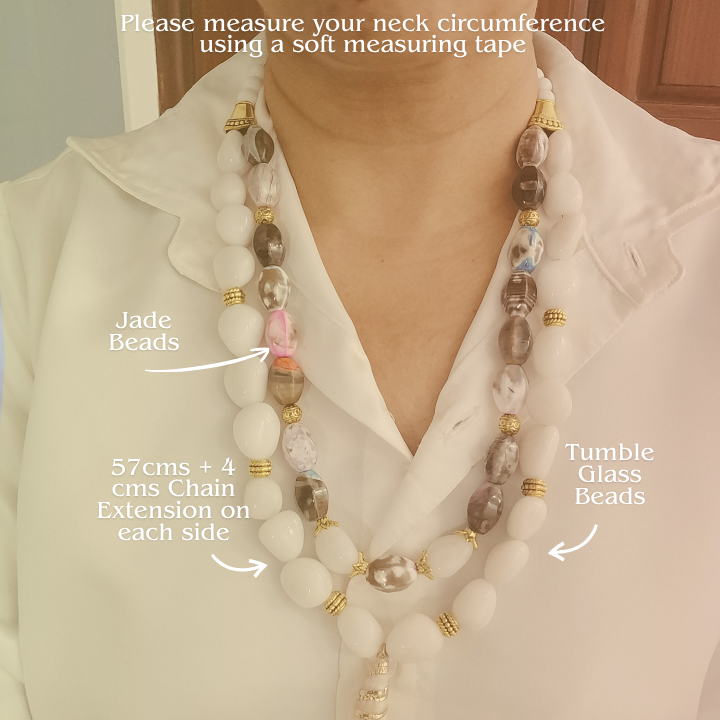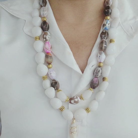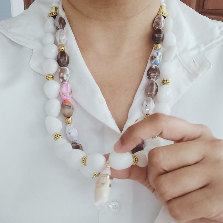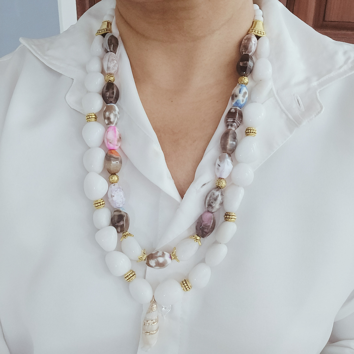 “Two strands flow together like the meeting of shore and wave — one adorned with glass jade beads and tumble glass stones, the other anchored by a porcelain shell pendant that whispers of distant coasts and quiet strength.”