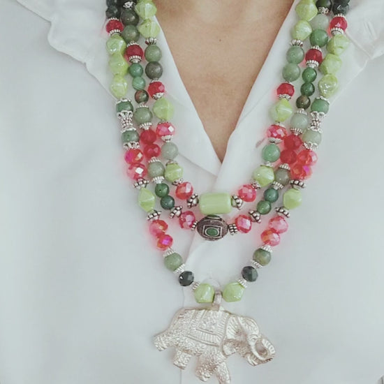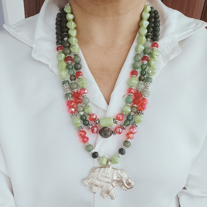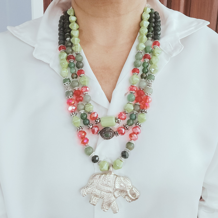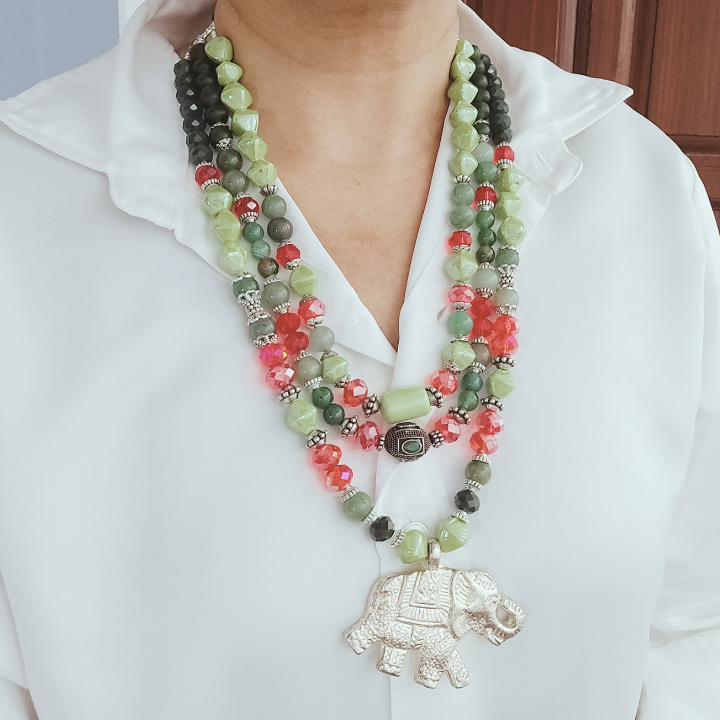 Handcrafted with glass and ceramic beads in festive hues of green and crimson, this creation celebrates tradition through color and artistry.