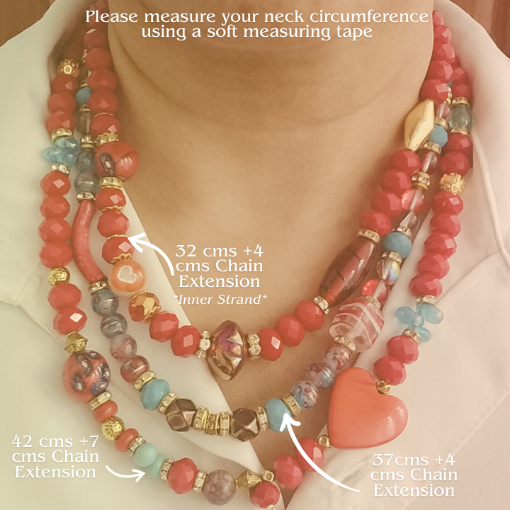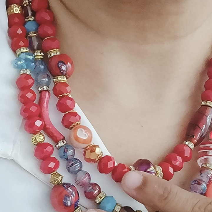 Nazakat Mosaic is a celebration of joyful elegance — the moment dusk turns to dreams, when colors dance and individuality stands bold without apology. Three artful strands of ruby-red, turquoise, blue, and golden glass beads swirl together, crowned by gold-toned accents and playful, hand-painted porcelain touches.