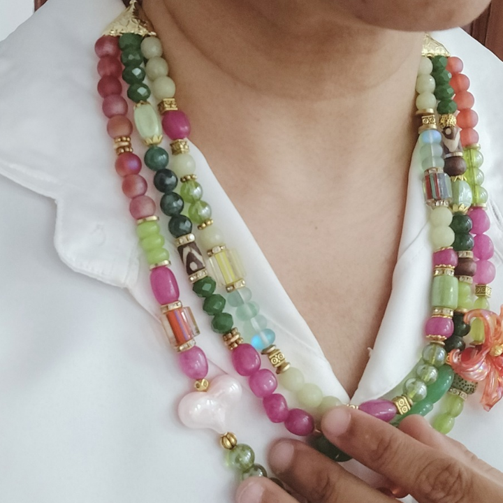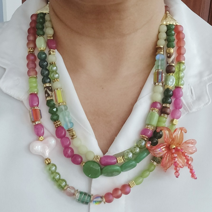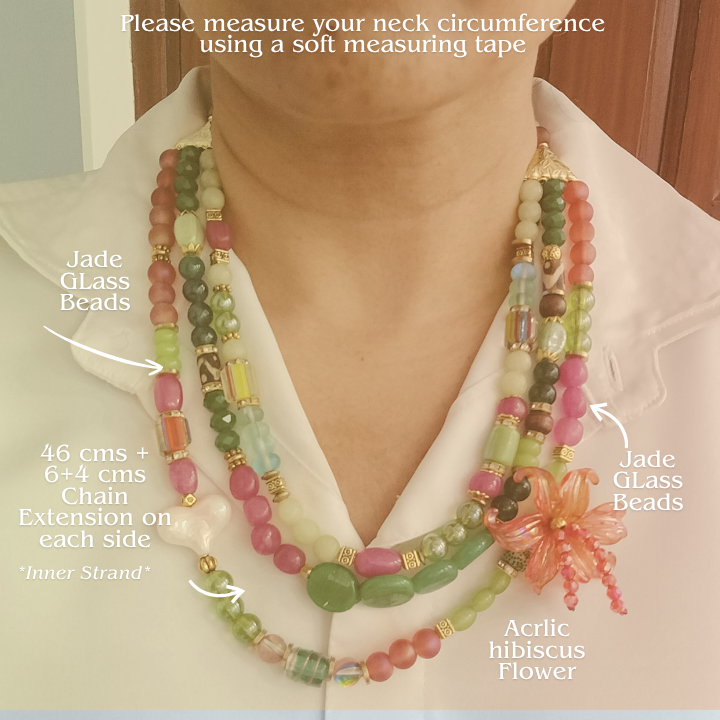Three vibrant strands of jade, glass, and porcelain beads intertwine in a joyful symphony of hues — kissed by brass accents and crowned with an acrylic hibiscus bloom that whispers of tropical grace. A tiny heart bead rests amidst the colors, a symbol of love nestled in light.