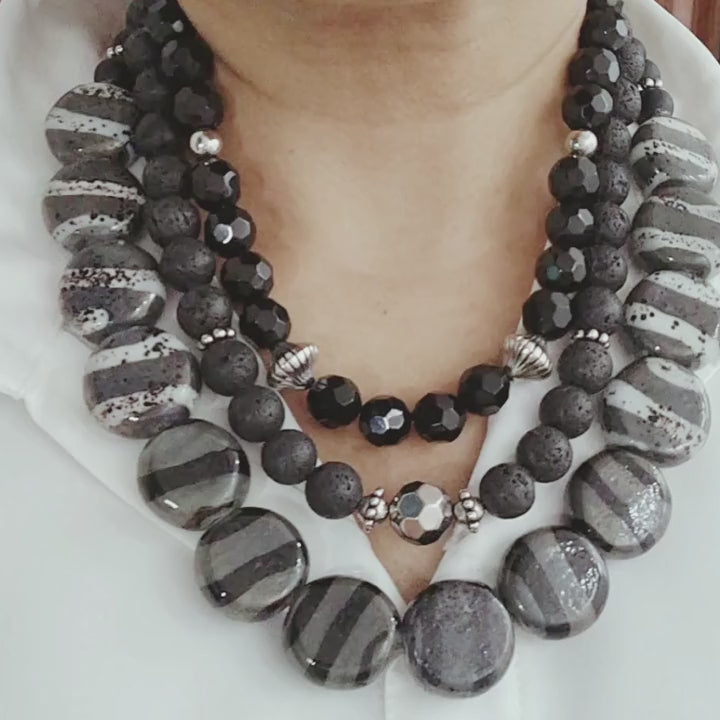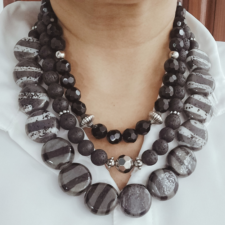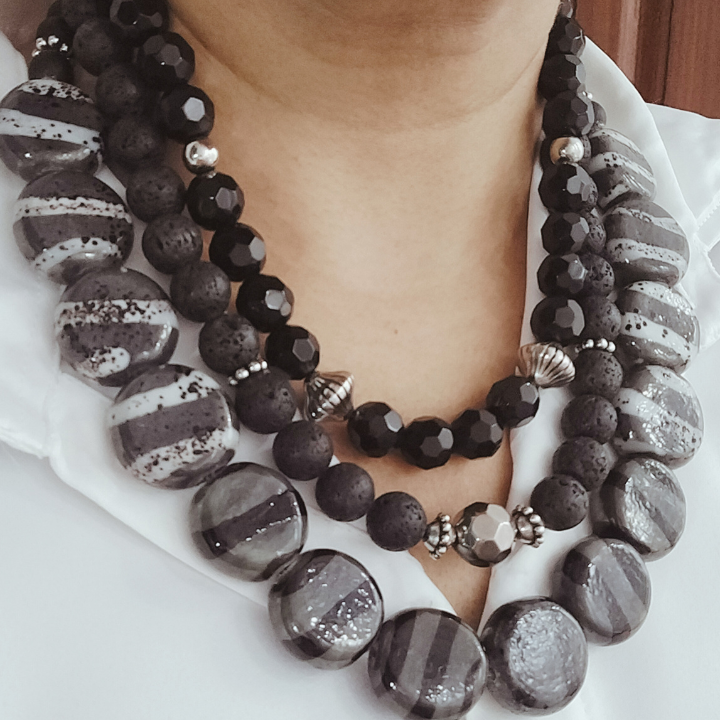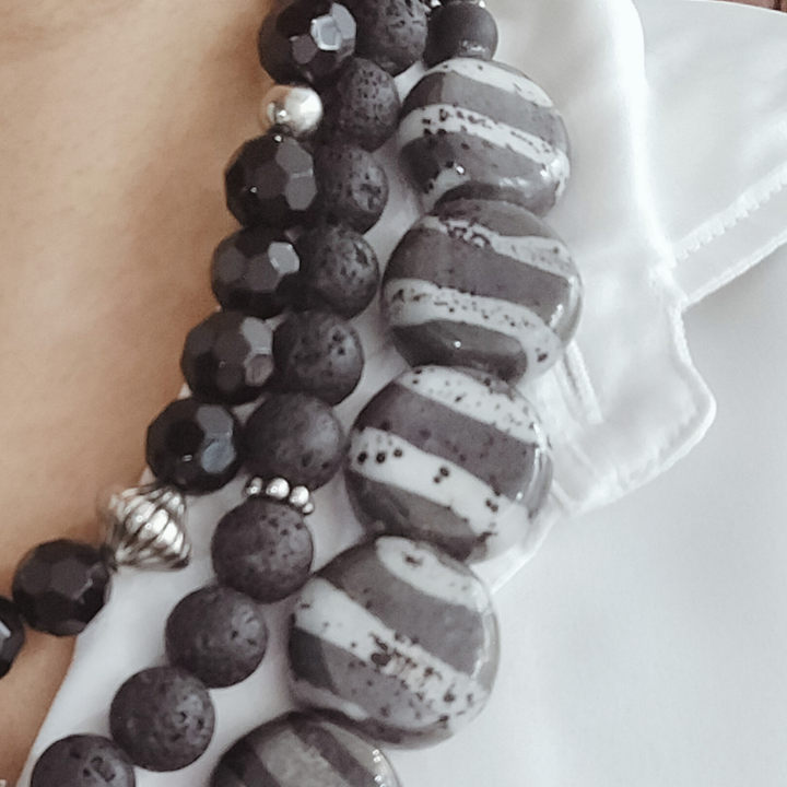 A statement of bold elegance, Siyah Époque is a three-layered handcrafted necklace featuring a striking medley of ceramic beads, raw-textured lava beads, and shimmering gunmetal glass beads, all set in silver accents. Finished with an adjustable chain extension and a heavy lobster clasp, this piece balances strength with sophistication.