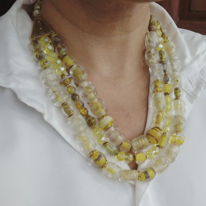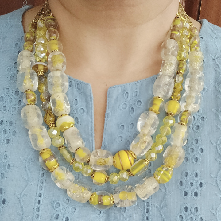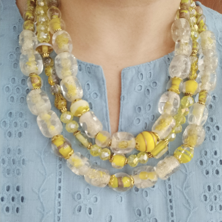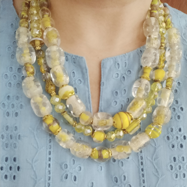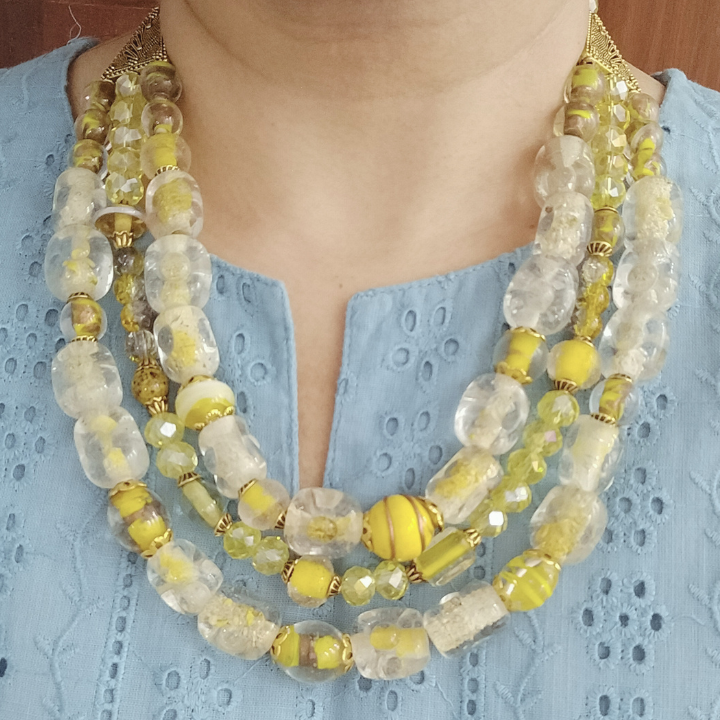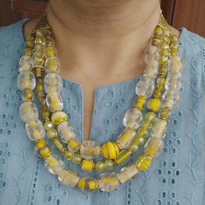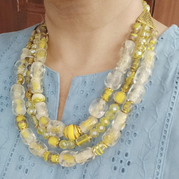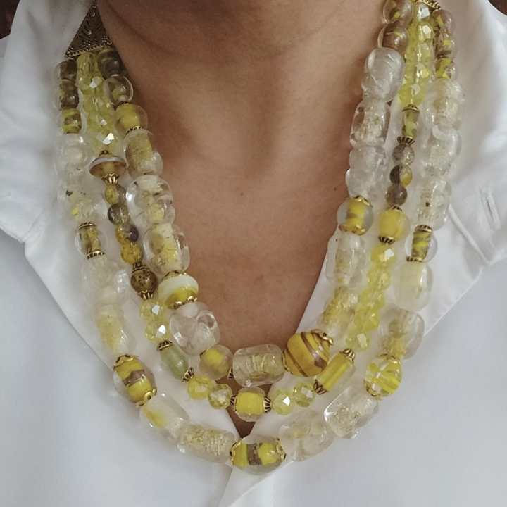 Bathed in golden light, the Sunkissed Majesty Necklace captures the brilliance of the sun in a bold, handcrafted statement piece. A 3-strand necklace strung with chunky glass beads in warm sunlit tones, highlighted with luxe gold accents for a touch of royal elegance - finished with a chain extender closure, allowing for adjustable length and styling versatility. The Sunkissed Majesty isn’t just jewelry — it’s an aura. It’s the warmth of sunshine, the boldness of gold, and the timeless essence of regality woven into one radiant masterpiece.