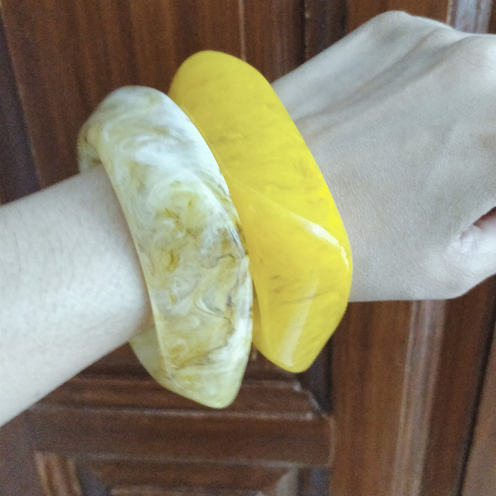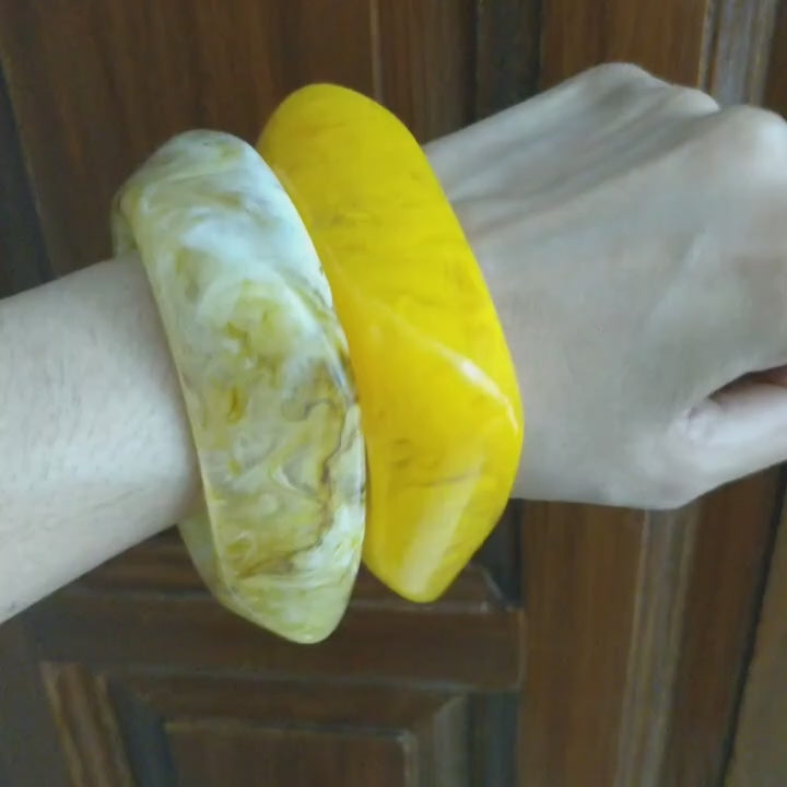 Each curve captures movement โ fluid, imperfect, yet beautifully intentional. The golden-yellow bangle glows with vitality, while the ivory-marbled one balances it with serenity โ together, they embody the dance of warmth and calm, confidence and grace.