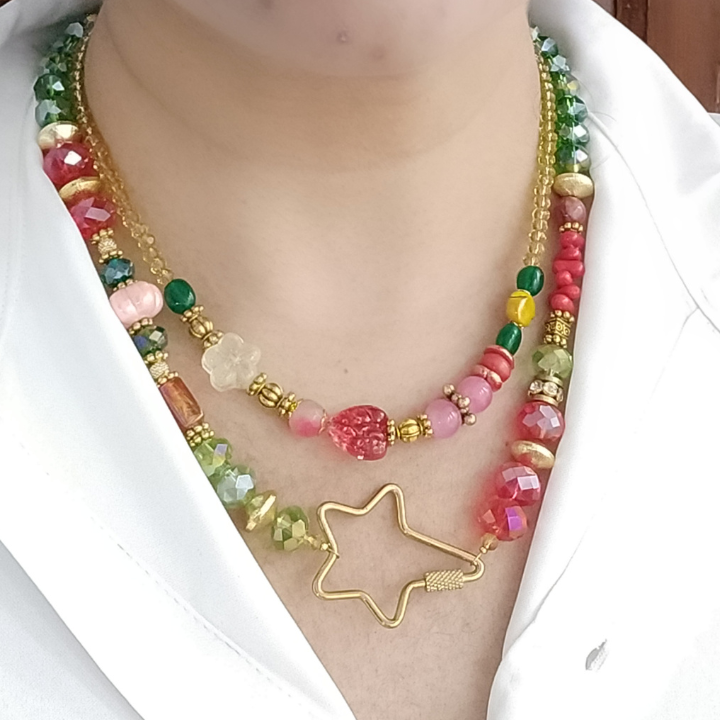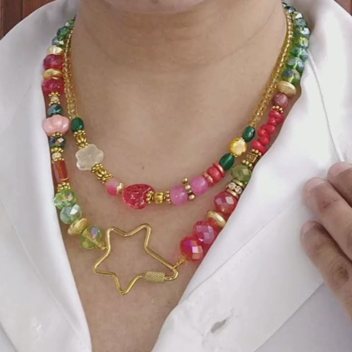 This isn’t just a neckpiece — it’s a mood. The Twinkle Tangle Candy Mix Necklet is a bold burst of joy, handcrafted with a mix of crystal beads, pops of gold, and a cheeky star clasp that gives ✨main character energy✨.