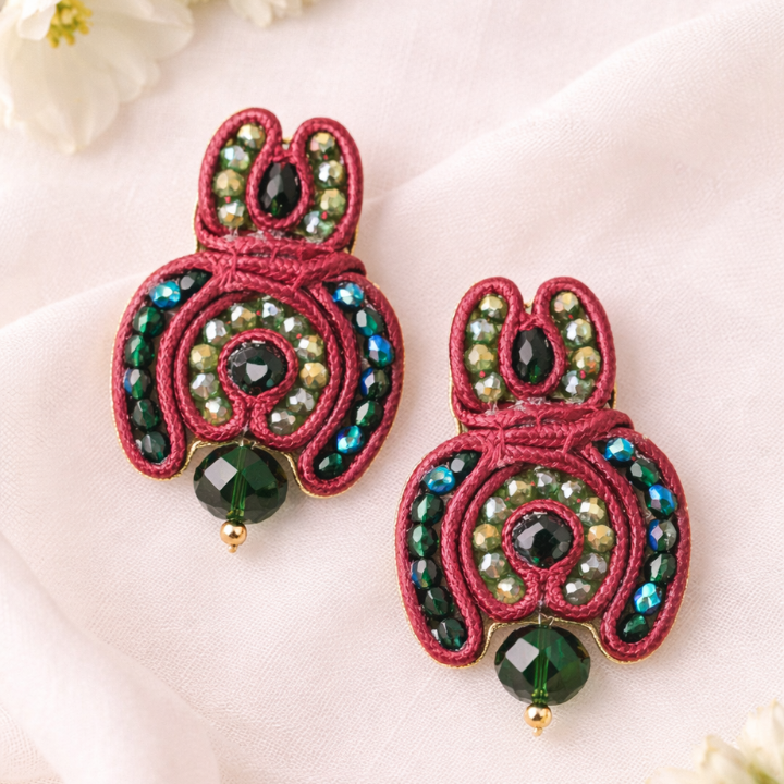 Handcrafted using rich burgundy threadwork, layered circular forms, and faceted green beads, these earrings feel organic and bold at once. The interplay of deep wine tones with lush greens creates a raw, nature-led aesthetic that feels grounded yet dramatic.