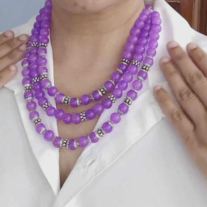 Step into timeless elegance with Viola Royale — a majestic necklet crafted with luscious purple glass beads, accentuated by antique silver-toned spacer crowns. This layered statement piece drapes like poetry around the neck, bringing together old-world charm and contemporary flair.