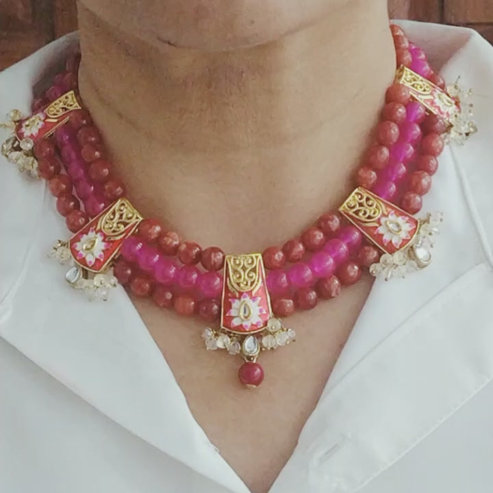 Layered with dual strands of ruby-pink agate beads, the collar curves gently around the neck like a garland of blossoms in full summer bloom. Each enamelled Kundan plaque is hand-painted in deep gulabi tones and crowned with a tear-drop polki, catching light the way petals hold morning dew. Tiny clusters of pearls and crystals sway beneath, adding movement, shimmer, and intimacy to the design.